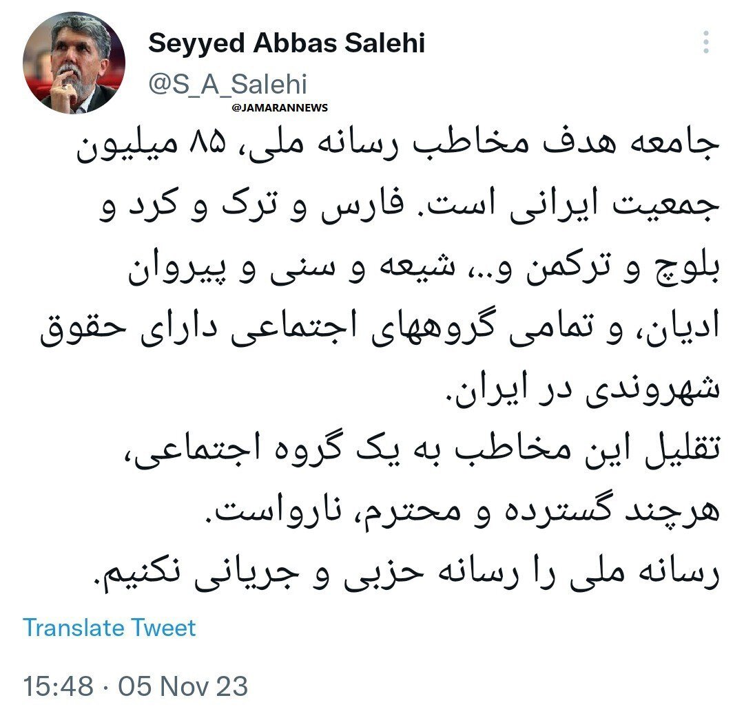 جامعه هدف مخاطب رسانه ملی، ۸۵ میلیون جمعیت ایرانی است. فارس و ترک و کرد و بلوچ و ترکمن و..، شیعه و سنی و پیروان ادیان، و تمامی گروههای اجتماعی دارای حقوق شهروندی در ایران. تقلیل این مخاطب به یک گروه اجتماعی، هرچند گسترده و محترم، نارواست. رسانه ملی را رسانه حزبی و جریانی نکنیم.